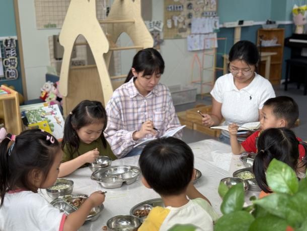 依托课程游戏化“生活赋能”导向,教师们分为9个小组,深入班级对入园、晨锻、进餐、盥洗、饮水、如厕、过渡等生活环节开展沉浸式观摩与记录,重点从“健康与安全”、“自主与责任”和“文化与幸福”等三个维度对幼儿生活行为进行观测与记录。观摩过程中,教师们运用视频录制、拍照分析、叙事记录和检核表等方法记录幼儿行为与表达,为质量评价与问题诊断提供多维度实证依据。
