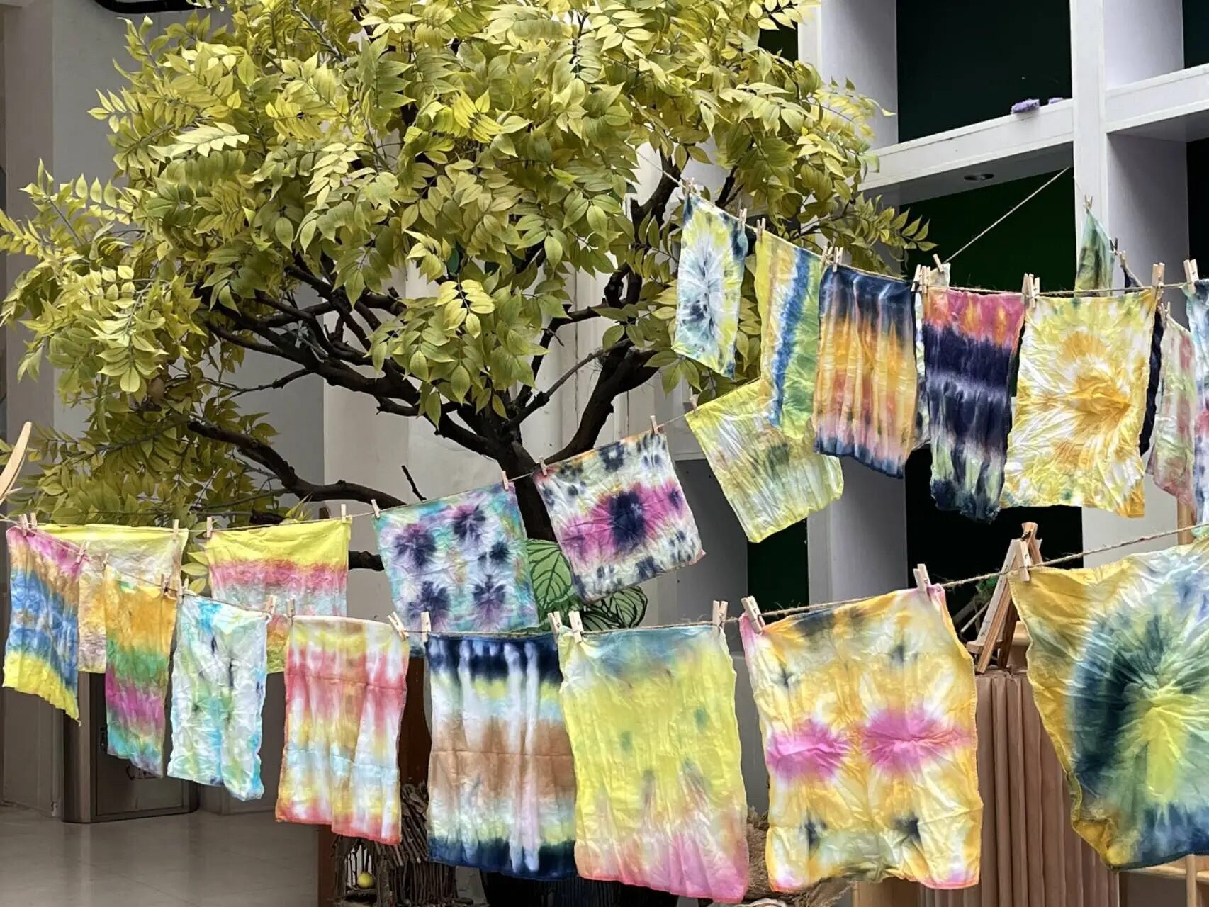 活动伊始,色彩绚丽的扎染作品便牢牢吸引了孩子们的目光。芠汐妈妈以生动有趣的语言和直观的操作图片,为孩子们揭开了扎染技艺的神秘面纱。从扎染的文化渊源到生活中的实际应用,孩子们全神贯注,在这项古老技艺体验进行亲身感知,直接操作