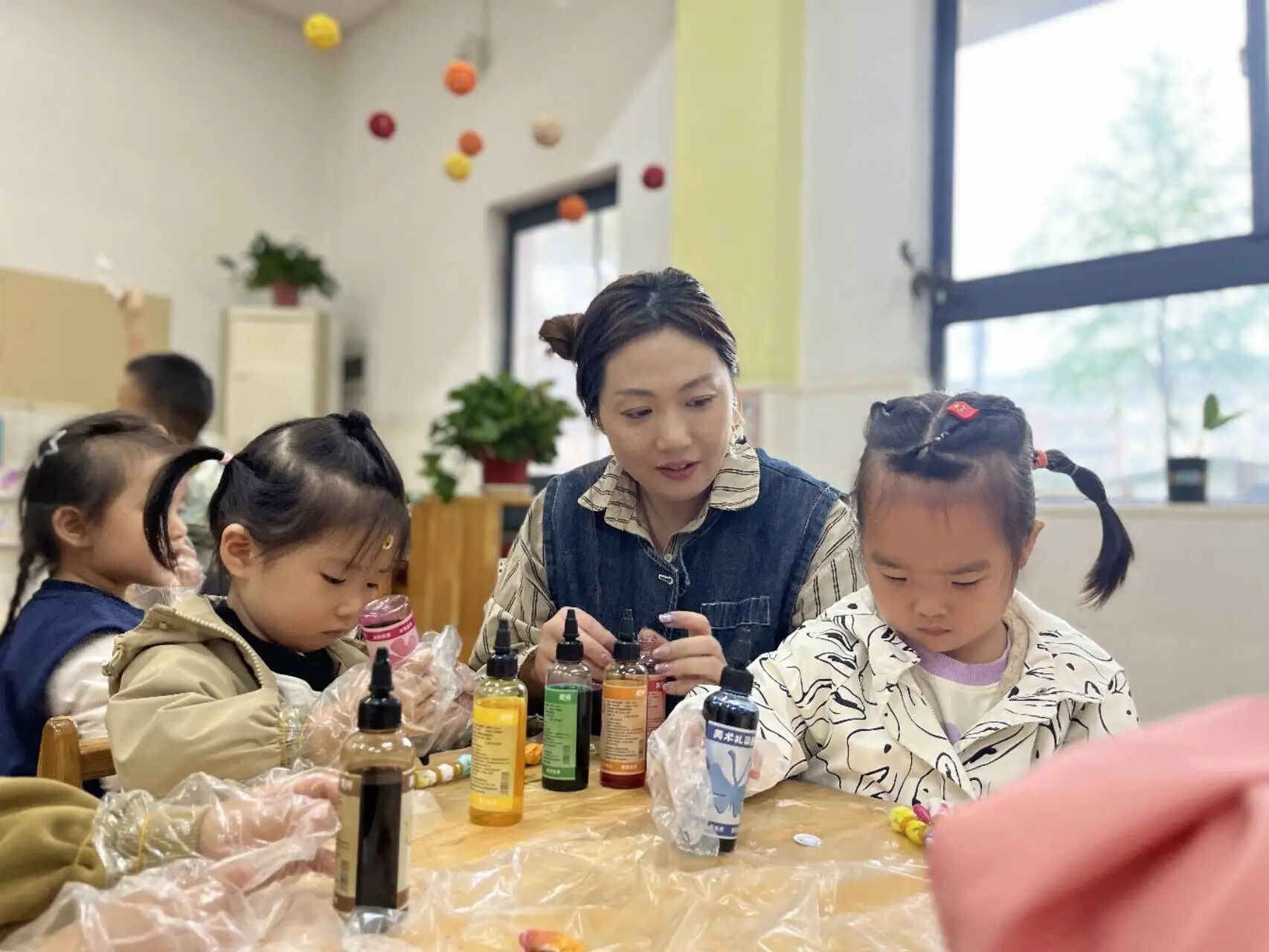 动手操作环节将活动推向高潮,教室瞬间变成了充满创意的“艺术工坊”:有的孩子小心翼翼地卷着布料、扎紧皮筋,口中念念有词“别让颜色跑掉”;有的与同伴默契配合,分工叠布、递皮筋;还有的小朋友将布料巧折成三角形,创造出可爱的“小粽子”造型。芠汐妈妈穿梭其间,耐心指导每个操作细节。