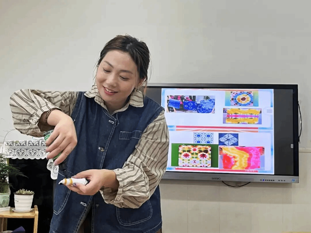 芠汐妈妈将复杂的扎染工艺编成朗朗上口的儿歌:“洗洗小毛巾、扎扎小辫子、白布穿花衣”。孩子们边念口诀边做动作,认真专注的神情流露出对传统技艺的敬畏与热爱。