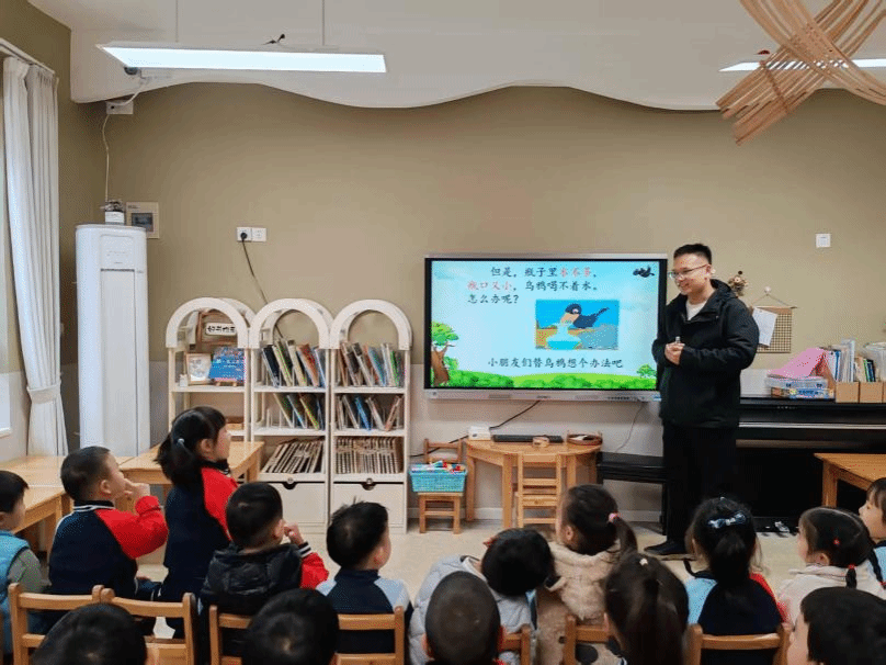 教育瞬间:“如果你是这只小乌鸦,你还能想出什么好办法喝到水呢?”孩子们的回答天马行空:“可以用吸管!”“找小伙伴一起搬石头!”庄旭爸爸巧妙肯定每一种创意,并引导大家理解故事的核心:遇到困难时,不放弃、勤思考,办法总比困难多。一束“智慧之光”,悄然照进孩子们的心田。