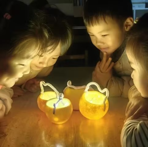 教育瞬间:故事结束后,真正的魔法开始了。在瑾玥妈妈的指导下,孩子们亲手制作起属于自己的“小橘灯”。当一盏盏散发着橘色暖光的小灯亮起,教室里充满了温暖与成就感。孩子们通过亲身体验,理解了立冬的“藏”与“暖”,更懂得了分享与创造的美好。