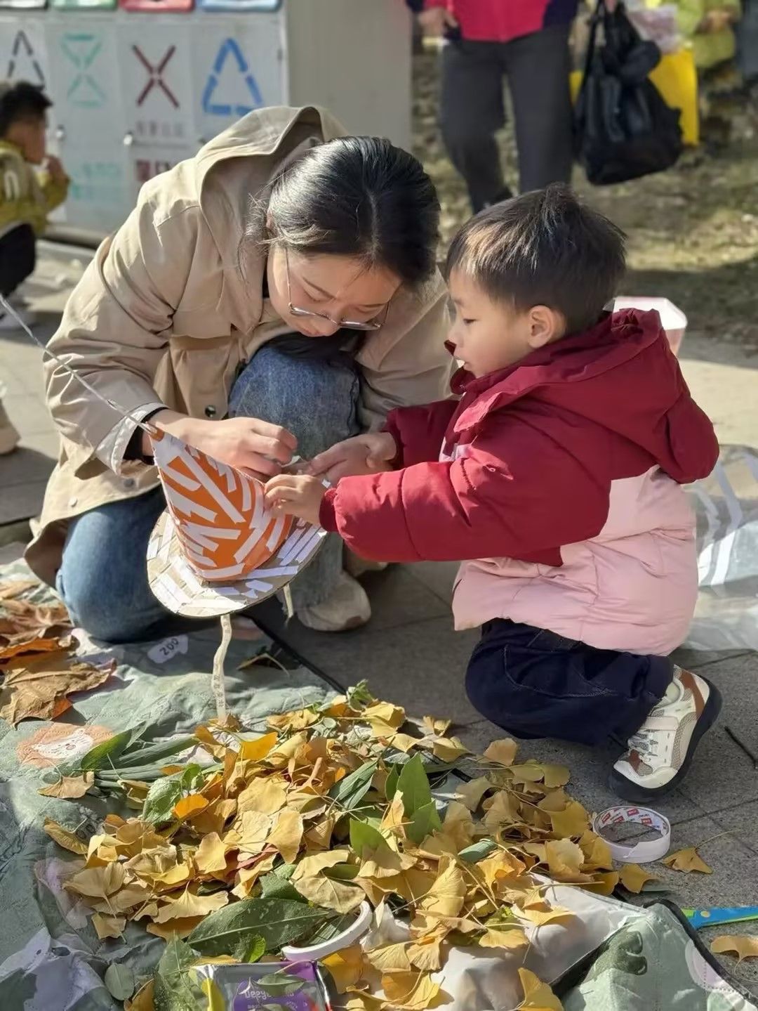 活动伊始,一场欢乐洋溢的彩虹伞亲子游戏迅速点燃了现场氛围,在默契的配合与欢笑声中,孩子们带着好奇与期待正式开启了自然探秘之旅。孩子们化身为专注的“自然探险家”,运用触摸、观察、聆听等多种感官,亲身感知树皮的粗糙肌理、银杏叶片的细腻脉络,聆听脚下落叶的簌簌声响,于细微处发现自然的奥秘。在亲子创意制作环节,家长与孩子们共同利用收集来的落叶、松果等自然物,设计并制作出独具特色的“树叶时装”,在动手协作中深化情感联结,激发艺术创造力。